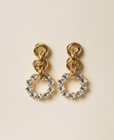 Goldfarbene Ohrringe aus Kordelkettengliedern mit strassbesetzten Ringanhängern und Steckverschluss.