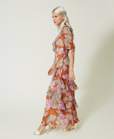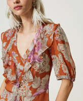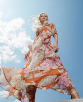 Maxikleid ist aus italienischem Krepon gefertigt, der mit einem ganzflächigen Exklusivdessin von Twinset bedruckt wurde, das aus Paisleymotiven und großen Rosen in Aquarelloptik besteht. Versehen ist das Modell mit einem V-Ausschnitt mit Volant und schräg verlaufenden Volants am Körper. Die ellbogenlangen Ärmeln mit geraffter Schulter werden von schmalem Bündchen geschlossen. Dazu kommen ein Seitenreißverschluss, eine Logoplakette an der Rückseite und ein passendes Unterkleid mit verstellbaren Trägern. Ein locker geschnittenes, feminines Must-have für besondere Anlässe.