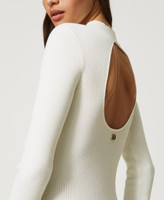 Maxikleids. Das edle Modell mit figurbetontem Schnitt ist aus Viskose-Stretch-Gestrick in Rippenverarbeitung gefertigt und mit einem Stehkragen versehen. Die anliegenden Ärmel öffnen sich nach unten hin, um einen angedeuteten Glockenschnitt entstehen zu lassen. Dazu kommen ein runder Cut-out zur Betonung des Rückens und eine „Oval T“-Logoplakette. Dieses Kleidungsstück wird garantiert alle Blicke auf sich ziehen.