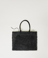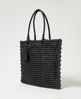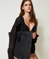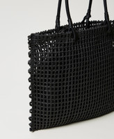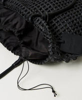 Strandtasche aus Strohimitat in Netzverarbeitung mit Rundhenkeln für die Schulter, Logo-Charm, Bogenrändern an den Seiten und herausnehmbarem Innenbeutel aus Canvas mit Kordelzug.