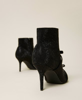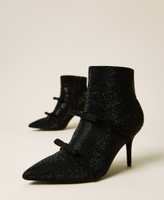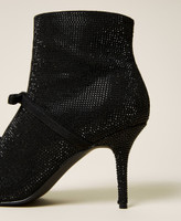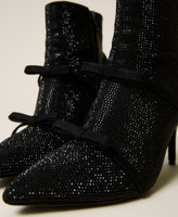 Stiefelette der Actitude Collection mit Allover-Strassbesatz und Schleifen, spitz zulaufender Schuhspitze, Reißverschluss an der Innenseite und Stiletto-Absatz.