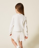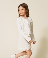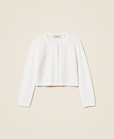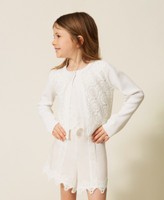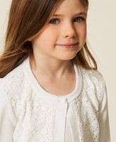 Strickjacke für Mädchen mit Stehkragen aus Viskose-Mischstrick mit zwei Spitzeneinsätzen auf der Vorderseite. Gerade geschnittenes Modell mit Knopfverschluss und Rundhalsausschnitt.