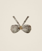 Bandeau-Bikinitop aus floralem Jacquard-Gewebe, ein Exklusivmotiv von Twinset. Einfarbiges gefüttertes und wattiertes Modell mit herausnehmbaren Cup-Einlagen und Seitenstäbchen, einem mittigen Schmuckdetail aus Metall und Perlenanhänger, breiten Trägern zum Binden am Nacken und einem Bindeverschluss am Rücken und einem Schleifenverschluss auf der Rückseite.