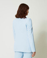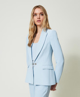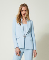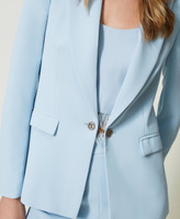 Blauer aus elastischem Crêpe-Cady mit gebrochen steigendem Revers und Schmuckverschluss mit Kettenknöpfen mit „Oval T“-Logo.