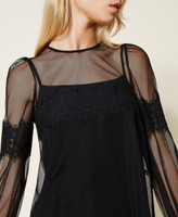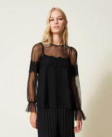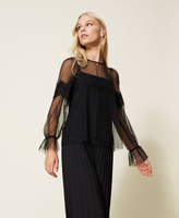 Bluse aus Tüll mit applizierter Makrameespitze an den Ärmeln und in der Mitte, Tropfenausschnitt an der Rückseite und passendem Top. Dieser Artikel ist Teil der „Archive“-Auswahl, die von den ikonischsten und beliebtesten Pieces aus den Twinset-Kollektionen inspiriert wurde.