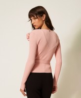 Ensemble aus der Kollektion Actitude aus Baumwollmischgarn-Qualität in Rippstrick. Der Cardigan ist ein Cache-Coeur-Modell mit einer Kreuzschnürung mit Bändern zum Binden auf Taillenhöhe, V-Ausschnitt und langen Ärmeln. Das Top ist mit Trägern und glatten Cups ausgestattet und zeigt ein Rippmuster auf Taillenhöhe. Figurbetontes Modell mit abnehmbarer Blumenbrosche aus Strick und Logo-Plakette aus Metall auf der Rückseite.