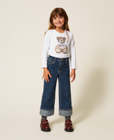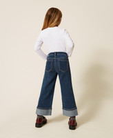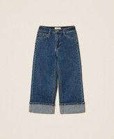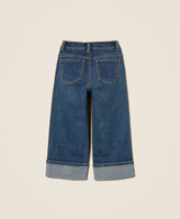 Mädchen-Stretchjeans aus Baumwolle in Cropped-Länge mit angenähtem Aufschlag am Beinabschluss und Hotfix-Strass. Das gerade geschnittene Five-Pocket-Modell mit blauem Medium-Wash hat Gürtelschlaufen und einen Verschluss mit Reißverschluss und Logoknopf.