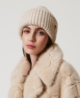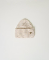 In Italien hergestellte Strickmütze mit Lurexgarn, Rippenmuster, breitem Umschlag und „Oval T“-Plakette aus Metall mit Finish in hellem Messington.