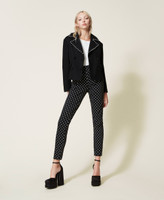Super-Skinny-Leggings aus Milano-Strick mit Allover-Tupfenprint, Seitenreißverschluss und Gürtelschlaufen. Mit und ohne den Charm mit Chatons und Actitude-Logo tragbar.