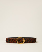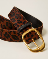 Low-Waist-Gürtel aus Cavallino-Leder mit geschecktem Animalprint, Lederschlaufen und Schnalle in gehämmerter Optik mit hellem Messingfinish.