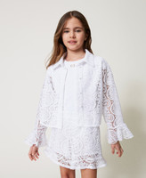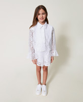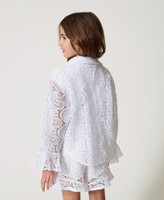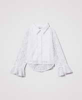 Gerade geschnittenes Mädchenhemd aus Makrameespitze mit bezogenen Knöpfen, Dreiviertelärmeln mit ausgestellten Abschlüssen und ein Jerseytop gegen die Transparenz mit „Oval T“-Logoplakette. Dieses Hemd ist perfekt für eine Hochzeit.