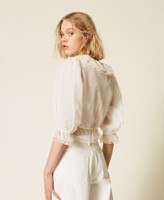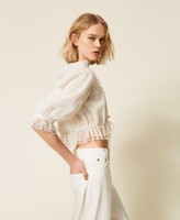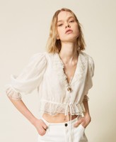 Locker geschnittene Hemdbluse aus Tüll mit kleinem floralem Muster und Volants, die den V-Ausschnitt vervollständigen, Verschluss mit Knöpfen und Tunnelzug auf Taillenhöhe, 3/4-Ärmeln mit Gummizug am Abschluss und Saumrüschen. Auch zur Verwendung als Oberbekleidung.