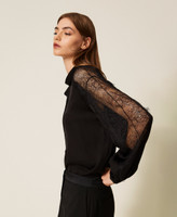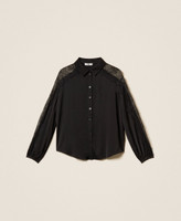 Hemdbluse aus Viskosesatin mit transparenten Spitzeneinsätzen. Locker geschnittenes Modell mit langen Ärmeln mit überschnittenen Schultern, schmalen Ärmeln mit leichtem Puff-Effekt und schmalem Bündchen, Knopfverschluss, abgerundetem Abschluss und einer herzförmigen Logo-Plakette auf der Rückseite.