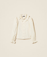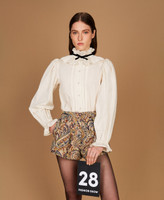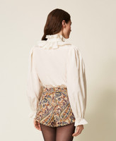 Hemdbluse aus Taft, einem leichten-Gewebe „Made in Italy“ mit griffiger, fester Haptik. Mit Stehkragen, verziert mit einem gekräuselten Volant und einem Verschluss mit einem kontrastfarbenen Pannesamtband. Gerade geschnittenes Modell mit eingesetzten, voluminösen Ärmeln mit überzogenem Gummizug und Volant an den Bündchen, Verschluss mit überzogenen Knöpfen sowie vertikalen Falten entlang der Öffnung.