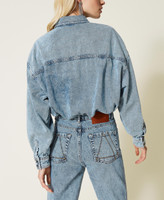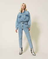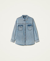Oversized Denimhemd mit Stone-Wash und dunkleren Schattierungen an den Taschen. Gerade Passennaht, lange Ärmel mit Gegenfalten an den Manschetten, Druckknöpfe – Utility-Style für jede Saison.