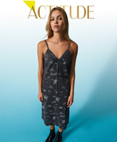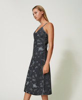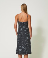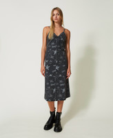 Schwarzes Midi-Jeanskleid in A-Linie aus der Actitude Collection mit Laserprint in Graffiti-Optik, schmalen Trägern und tiefem Ausschnitt.
