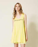 Ein frecher Schriftzug aus Chatons ziert dieses ärmellose A-Linien-Minikleid aus Baumwolljersey mit halbem Tellerrock, tiefem Ausschnitt und gerippten Bündchen. Dazu noch eine Zehentrennersandale oder Sneakers und schon ist der Look perfekt.
