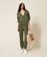 Hose aus Scuba aus Viskosemischung mit Ton-in-Ton Häkelapplikation an den Taschen. Modell im Joggers-Schnitt mit elastischem Bund, Eingrifftaschen und einem Herz-Logo aus Metall auf der Rückseite.