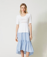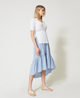 Kurzärmliges Midikleid aus Baumwollmischung mit einem Wechsel aus Durchbruch- und Rippenmustern, Logoschriftzug und Rockpartie aus gestreiftem Popeline.