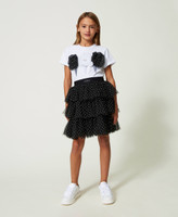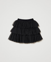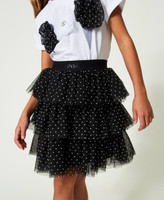 Kurzer Rock aus gerüschten Tüllvolants mit Flockprint-Tupfen, elastischem Taillenbund mit Logolettering-Print und Jerseyfutter.