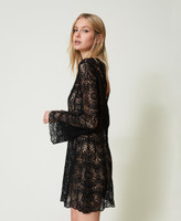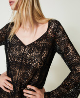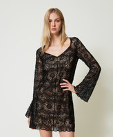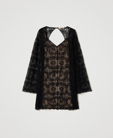 Kurzes Kleid aus durchscheinender Häkelarbeit mit ästhetisch geformtem Ausschnitt, langen Ärmeln, Cut-out an der Rückseite und dazugehörendem Unterkleid.