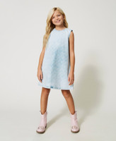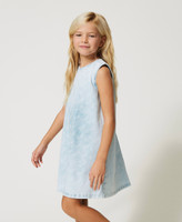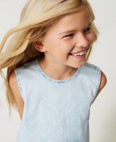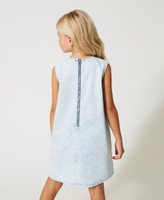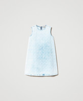 Kurzes, ärmelloses Jeanskleid mit Bleaching, Allover-Logoprint, Metallreißverschluss an der Rückseite und weißen Steppnähten.