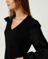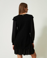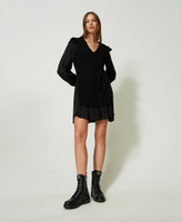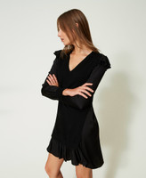 Dieses originelle „kleine Schwarze“ aus Viskose-Stretch-Gestrick besticht durch seinen leicht übergroßen Schnitt mit Jacquarddessin aus kleinen Tupfen. Das Modell mit V-Ausschnitt und Seitenschlitzen wird an der Unterpartie von einem leicht gerafften Stoffvolant verziert. Dazu kommen Stoffärmel mit gerippten Bündchen, Flügelvolants aus Jacquard an den Schultern und ein Oval T an der Rückseite. Der übergroße Schnitt versprüht lässige Eleganz.