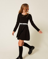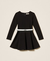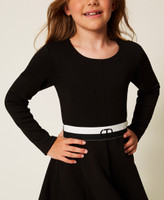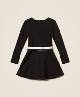 Kurzes Mädchenkleid aus Viskosescuba kombiniert mit einem zweifarbigen, abnehmbaren Stretchgürtel mit glänzendem Logodruck und Druckknopfverschluss. Das Modell hat einen Rundhalsausschnitt, lange Ärmel, ein Futter aus Stretch-Baumwolljersey an der Oberpartie, längs verlaufende Teilungsnähte, einen Halbtellerrock, einen Reißverschluss an der Rückseite und eine figurbetonte Passform mit ausgestelltem Rock.