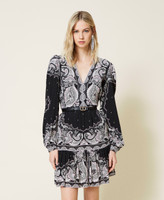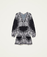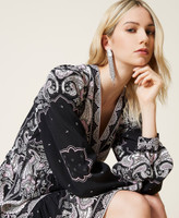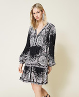 Kurzes Kleid aus fließendem Viskosekrepp mit platziertem Bandanaprint, V-Ausschnitt, Volant an der Unterpartie und Seitenreißverschluss.