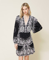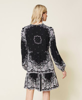 Perfekt für die Arbeit und besondere Anlässe: Dieses kurze Kleid aus fließendem italienischem Viskosekrepp besticht durch den grafischen Touch des platzierten Bandanaprints – ein Exklusiv-Dessin von Twinset. Das locker geschnittene Modell mit V-Ausschnitt und Volant an der weiten Rockpartie ist mit langen Raffärmeln mit schmalem Bündchen und einem verdeckten Seitenreißverschluss versehen. Dazu noch eine Sandalette mit hohem Absatz und der Stil ist komplett.