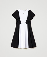 Kurzes, zweifarbiges Kleid aus elastischem Milano-Strick aus Viskose mit kurzen Volantärmeln, Taillennaht und Reißverschluss an der Rückseite.