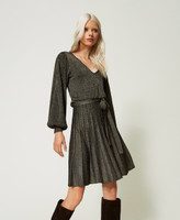 Kurzes Kleid aus Viskose-Lurex-Mischung mit Falten in Plisseeoptik am Rock, V-Ausschnitt, langen, lockeren Ärmeln und passendem Gürtel.