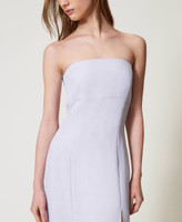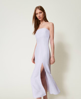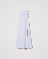 Maxikleid aus Leinen-Viskose-Mischung mit Bustier-Konstruktion mit Miederstäbchen. Das Modell hat einen Reißverschluss, einen asymmetrischen Schlitz an der Unterpartie sowie eine „Oval T“-Logoplakette an der Rückseite und ist figurbetont und unten ausgestellt geschnitten.