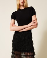 Langes Kleid aus Stretch-Viskosestrick mit Unterteil aus Plumetis-Spitze, appliziert in horizontalen Bahnen auf leicht gerafftem Tüll. Figurbetontes Modell mit locker fallendem Abschluss, Rundhalsausschnitt und kurzen Puffärmeln.