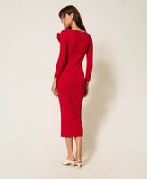 Kleid aus der Kollektion Actitude aus einer Baumwollmischgarn-Qualität in Rippstrick und einem dekorativen Maschenmuster auf Taillenhöhe, das die Silhouette betont. Figurbetontes Modell V-Ausschnitt, langen Ärmeln, einer abnehmbaren Blumenbrosche aus Strick und einer Logo-Plakette aus Metall auf der Rückseite.