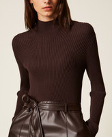 Langes Kleid im gerippten Strick mit ausgestelltem Rock in Lederoptik. Figurbetontes Modell mit locker geschnittenem Rock, Stehkragen, langen Ärmeln und der „Oval T“-Logo-Plakette auf der Rückseite.