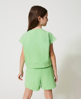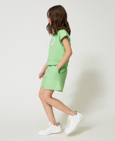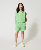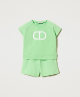 Zweiteiler aus elastischem Baumwollsweat, bestehend aus einem Kurztop mit „Oval T“-Glanzprint und einem Paar Shorts mit elastischem Taillenbund und Seitentaschen.