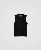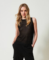 Kurzärmliges Top aus plattiertem Viskose-Lurex-Garn mit erhabenen Rippen, Durchbruchmuster an der Oberpartie und rundem Hals.
