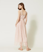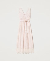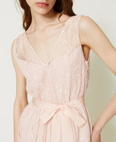Die charakteristischen Chiffren von Twinset wurden neu interpretiert für dieses Maxikleid aus Chantillyspitze mit floraler Stickerei und Festonrand. Das ärmellose Modell mit lockerem Schnitt hat ein eingesetztes Gummiband in der Taillennaht und einen V-Ausschnitt an der Vorder- und Rückseite. Dazu kommen ein Seitenreißverschluss, ein Futter aus Crêpe de Chine und eine „Oval T“-Logoplakette an der Rückseite. Mit dem dazugehörenden Ripsbandgürtel wird die Taille gekonnt betont.