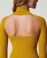 In Italien hergestelltes Maxikleid aus Viskosemischung mit Rippenmuster und Cut-out an der Rückseite. Das figurbetont geschnittene Modell ist mit einem Rollkragen und langen Raglanärmeln versehen.
