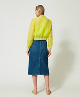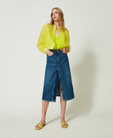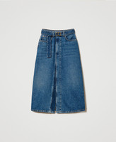 Midiröcke aus Denim liegen aktuell wieder stark im Trend und Twinset stellt hier eine Interpretation aus indigoblauem Baumwolljeansstoff mit leichtem Stone-Wash vor. Das geradlinige Regular-Waist-Modell mit Gürtelschlaufen und fünf Taschen ist an der Vorderseite hoch geschlitzt. Der Gürtel mit „Oval T“-Logoschnalle aus Metall rundet das Gesamtbild individuell ab. Vielseitig kombinierbar für zahllose Anlässe.