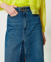 Midirock aus indigoblauem Baumwolljeansstoff mit leichtem Stone-Wash, fünf Taschen, Regular-Waist-Schnitt und passendem Gürtel.