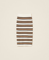 Strickrock aus gestreifter Viskosemischung mit Piquémuster. Das anliegend geschnittene Modell hat einen elastischen Taillenbund und eine Logoplakette aus Metall an der Rückseite.