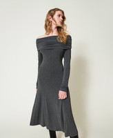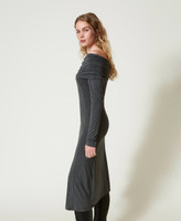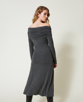 Langärmliges Midikleid aus Jersey mit locker fallendem, umgeschlagenem U-Boot-Ausschnitt, das auch schulterfrei getragen werden kann. Figurbetontes Modell mit längs verlaufenden Teilungsnähten und farblich abgestimmtem Logo aus Fadenstickerei am Handgelenk.
