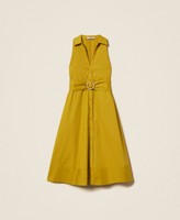 Locker geschnittenes Midikleid aus elastischem Baumwoll-Popeline mit Revers, V-Ausschnitt, Verschluss mit Ton-in-Ton Knöpfen und abnehmbarem Gürtel mit Metallschnalle.