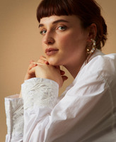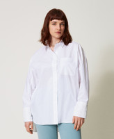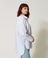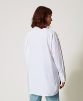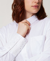 Hemd aus Baumwollpopeline mit Manschetten aus Makrameespitze mit floralem Dessin. Das Oversize-Modell hat einen klassischen Kragen, lange Ärmel mit überschnittenen Schultern, geschlitzte Manschetten mit Knöpfen, eine aufgesetzte Tasche auf der Vorderpartie, einen Knopfverschluss, einen abgerundeten, asymmetrischen Saum und eine „Oval T“-Logoplakette auf der Rückseite.