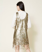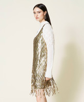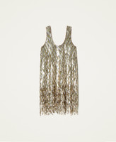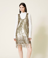 Kurzes Kleid mit von Hand aufgestickten Pailletten in verschiedenen Größen und Schattierungen, Fransen an der Unterpartie und Futter.