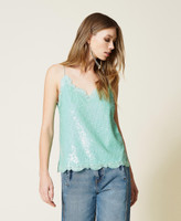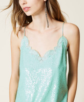 Top mit facettierten Alloverpailletten, bestickter Spitze an den Rändern und Seitenschlitzen.