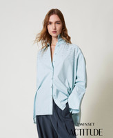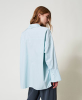 Gestreiftes Hemd aus der Actitude Collection aus garngefärbtem Popeline mit von Hand platziert aufgestickten Chatons. Das Modell hat lange Ärmel mit breiten Manschetten, einen Verschluss mit bezogenen Knöpfen, Seitenschlitze und einen lockeren, herrenmäßigen Schnitt mit hinten längerer Unterpartie.