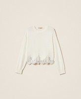 Pullover aus Angoramischung mit aufgesetzter Stickerei und einer Ton-in-Ton Spitzenborte mit Feston. Locker geschnittenes Modell mit glatt gestrickter Oberfläche, gewelltem Kragen, langen Ärmeln, gerippten Kanten und der „Oval T“-Logo-Plakette auf der Rückseite.